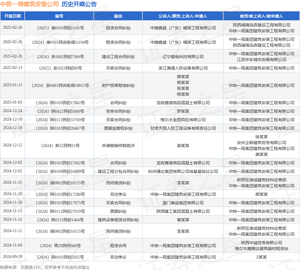 本站消息,根据天眼查APP显示,近日公布了一则中铁一局集团建筑安装工程有限公司作为被告/被上诉人的开庭公告,详细内容如下: